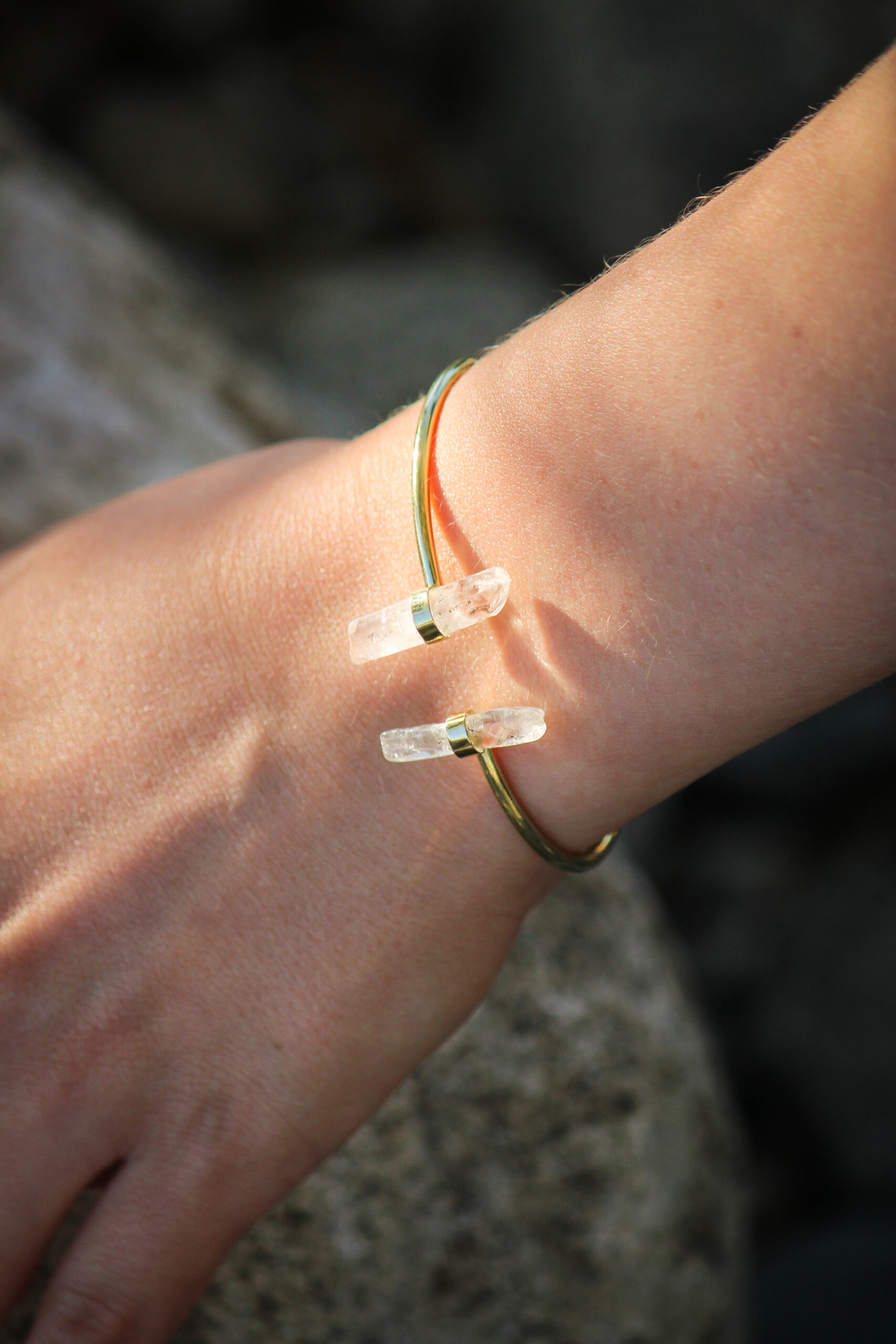 The Elysian Crystal Point Cuff, crowned with twin clear quartz stones, channels celestial energy in a modern, elegant form.